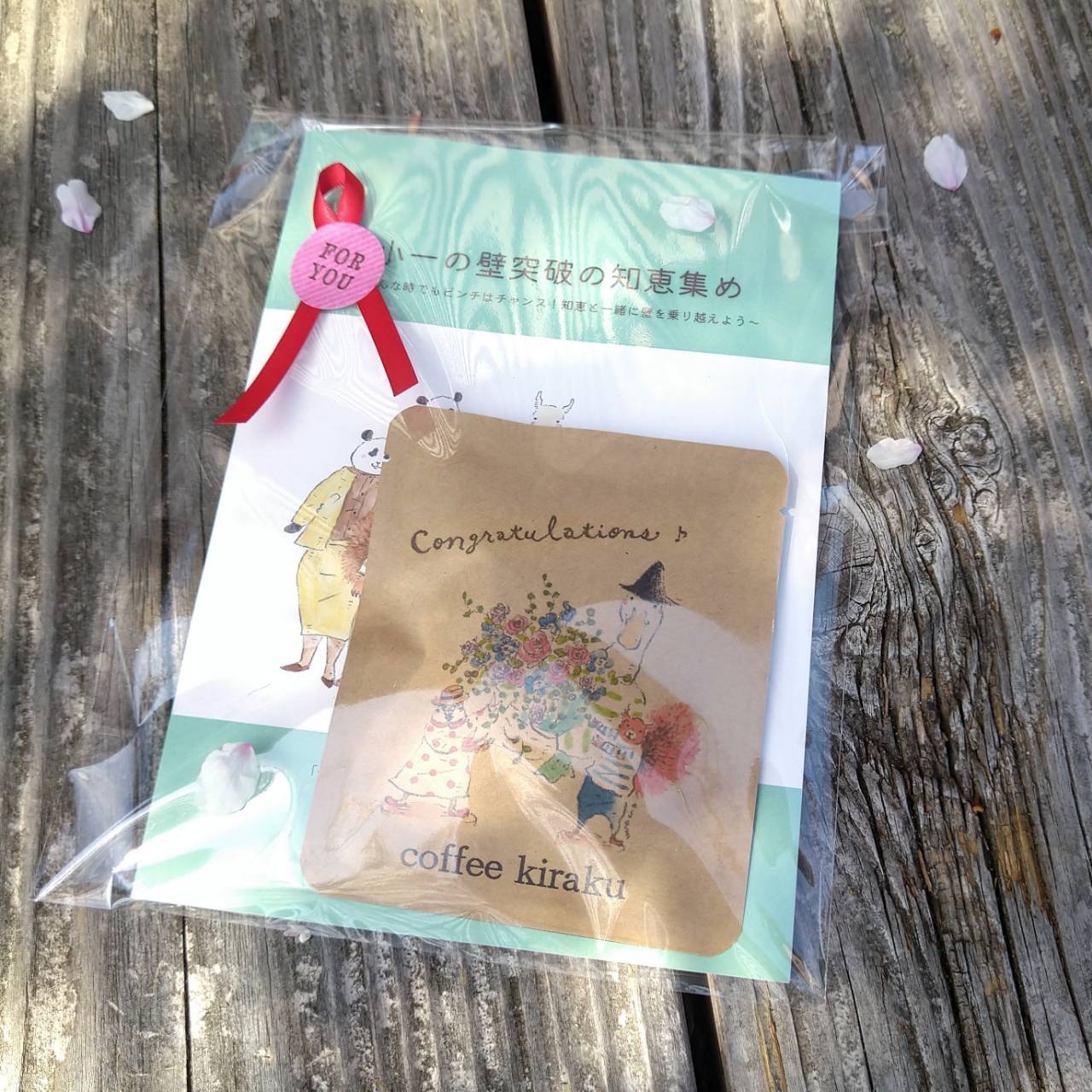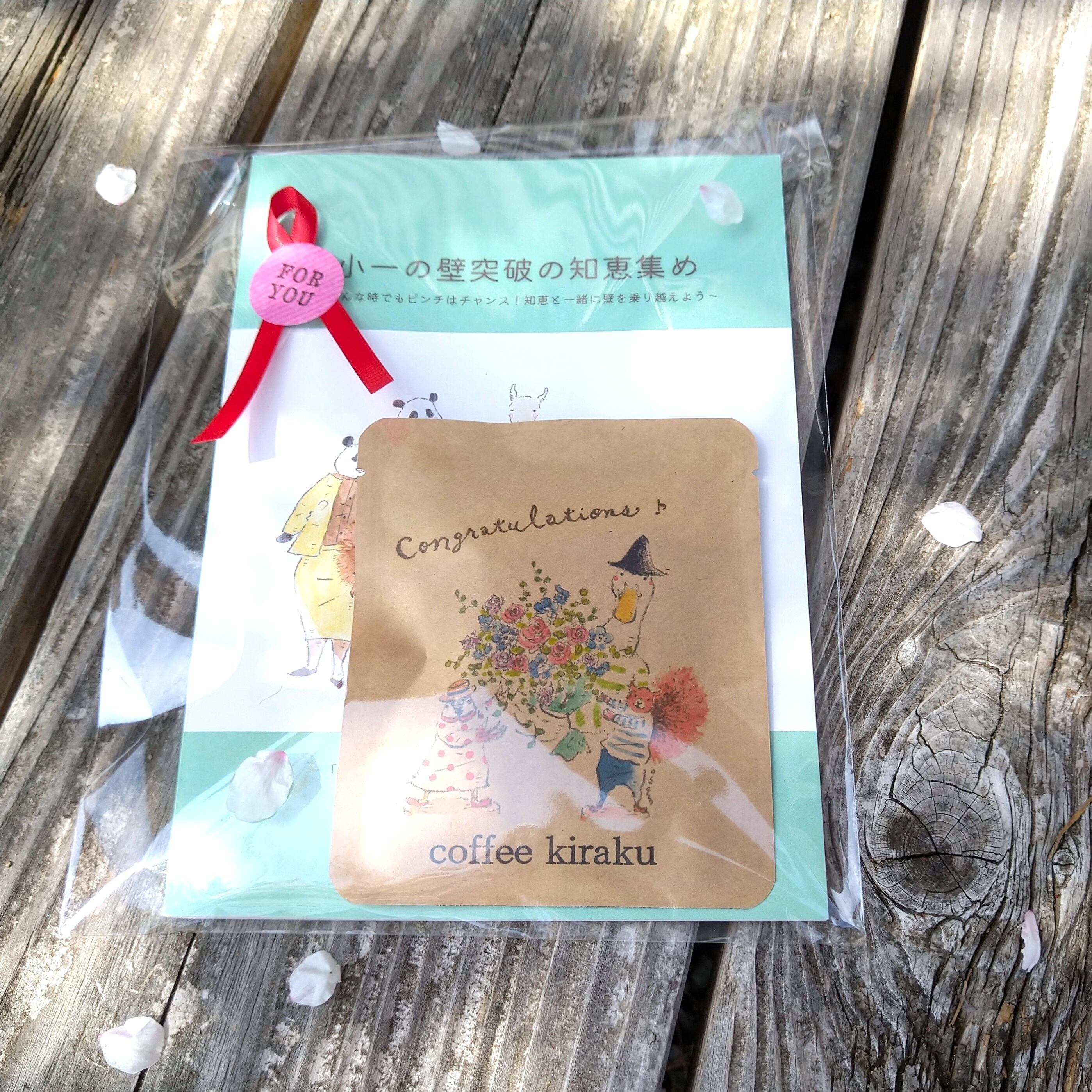 こちらは、小一の壁を迎える方へのプレゼントにしていただけるように、coffee kirakuさんのドリップコーヒーを添え、ラッピングしています。
